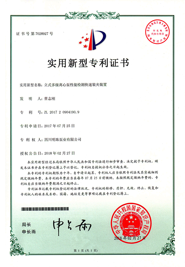 《立式多级离心泵性能检测快速装夹装置》实用新型专利证书