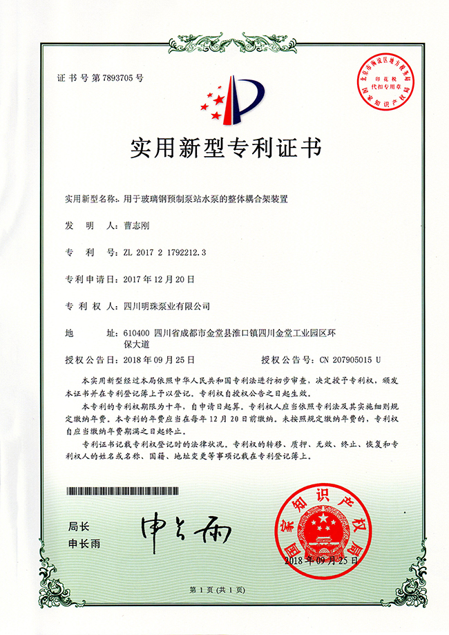 《用于玻璃钢预制泵站水泵的整体耦合架装置》实用新型专利证书