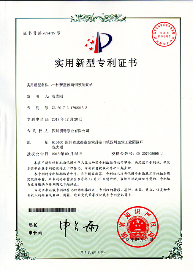 《一种新型玻璃钢预制泵站》实用新型专利证书