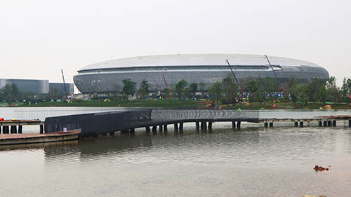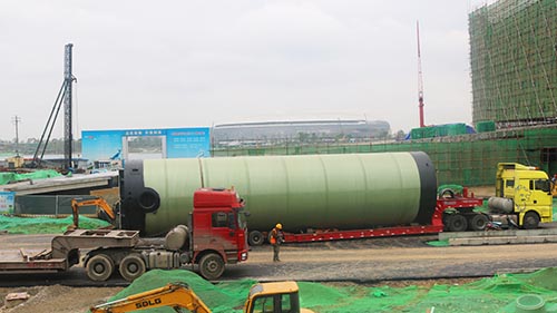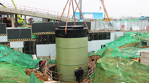 我司大型4.2*17米一体化预制泵站安装现场应用于市政工程环保建设!