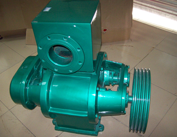 本机系由电机通过三角皮带轮带动主动转子转动,并通过同步齿轮带动从动齿轮驱动从动转子转动,两转子互不接触,且保持0.4mm左右的间隙量。转子与泵体及端盖间分别保持0.25mm左右的间隙量。运转过程中,在泵腔下部,由于两转子的不断分离,造成容积扩张,在上部由于两转子的不断接进造成容积的收缩,从而完成吸、排气体的作用,并在吸入侧造成真空,而排气侧与大气导通,接近大气压。泵体的出口有一消音箱,并同时具有稳定压力,密封作用,提高泵的工作效率。